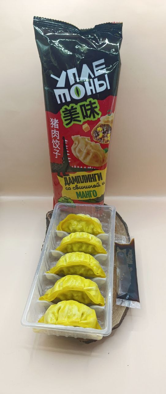 Дамплинги - это азиатские пельмени с разнообразными начинками, их можно готовить на пару, так же сварить или пожарить, я выбрала последний вариант. В пачке пять пельмешек и совсем немножко соевого соуса, но для такого обеда много и не надо. Конечно же меня интересовали не сами азиатские пельмени, а начинка - свинина с манго, весьма экзотично! Скажу так, в жаренном виде и с соевым соусом сладость от манго в пельменях не ощущается, я их разбирала на запчасти в поисках манго, да, есть маленькие кусочки, они редко попадаются в фарше. Мне блюдо понравилось, сытное, капусто-мясная начинка, соевый соус дополняет и сглаживает шероховатости, это хороший обед, про высоту цены каждый решает сам для себя, а я рекомендую.