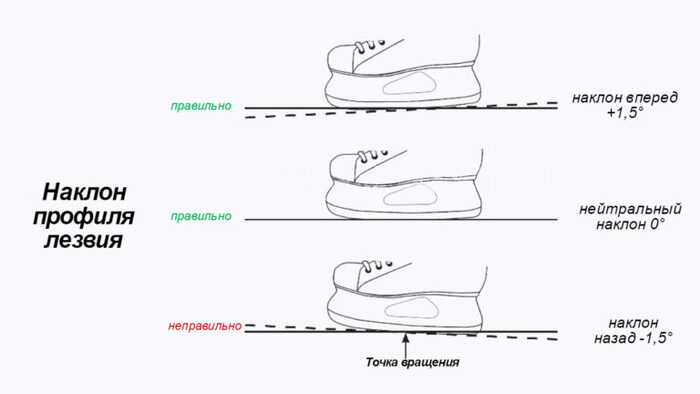 Наклон лезвия — это угол, под которым лезвие опирается на лед. При правильном профилировании наклон лезвия выбирается от 0° до 1,5°. Есть четкие рекомендации по выбору наклона лезвия. Для нападающего рекомендуют положительный наклон до 1,5°, а для защитников — 0°. Это обусловлено тем, что защитник достаточно много катается спиной вперед. И если наклон будет вперед, то это будет вызывать дискомфорт в катании. Нападающие же наоборот, наклон вперед способствует более агрессивному старту.