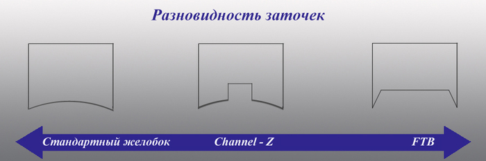 «Channel-Z». Уникальность этой заточки определена тем, что в ней также имеется желобок, как и в первом варианте, а также и еще один желобок с квадратным каналом – по середине обычного желобка. Канал Channel-Z имеет свою градацию соразмерности. Его глубина варьируется от 0,8 до 1,6 мм, а также по ширине канала. Z-канал имеет три разновидности по ширине: S, M, L. Как и у любой заточки у Z-канала есть как плюсы, так и минусы.