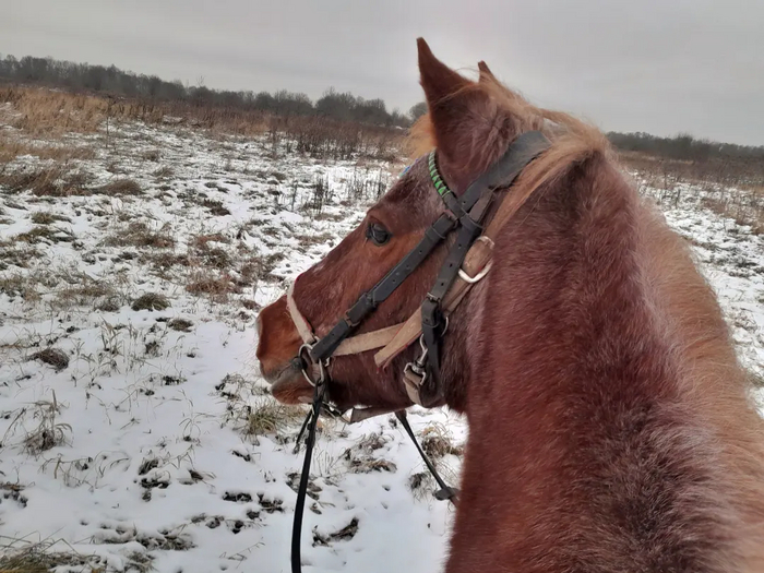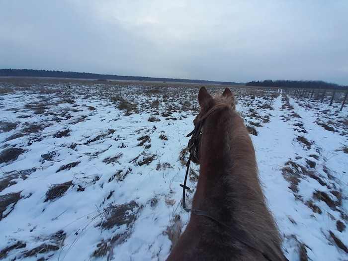 У Бубуши чувствительные копыта, поэтому сейчас мы выезжаем только в поля. На дорогах в посёлке к лесу и другому полю сейчас гололёд и колдобины, так что там лошадь встаёт намертво. Аккумулятор садится, включается задняя и все в этом роде. Кобылу не мучаю, катаемся по мягкому.