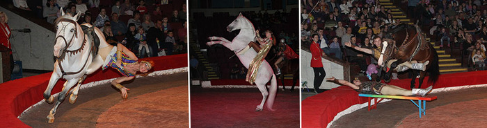 - «тройной курс» (синхронный прыжок 3-х исполнителей с манежа на спину бегущей лошади);