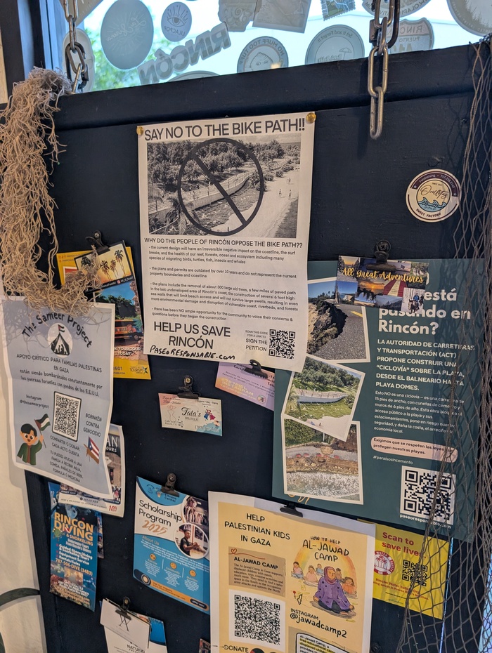 Один из рабочих вариантов узнать, что волнует местную модную молодежь это посмотреть на объявления в кофейне. На повестке дня Война в Палестине и Бойкот строительства велосипедной дорожки вдоль побережья. Мол, деревья вырубят, а дорожку опять при первом же шторме смоет. Также там и тут есть граффити против строительства элитных поселков "за шлагбаумом". Также к вашим услугам учитель йоги и левитации.