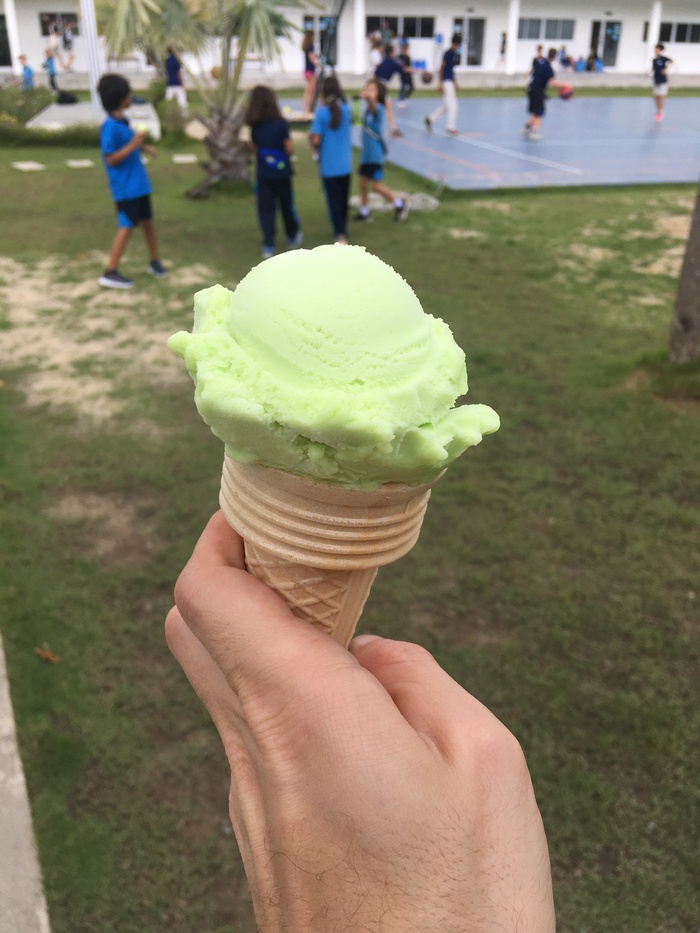 Обед. Учителя и ученики ели вместе в столовой или за столиками на улице. Еда была бесплатна для всех. На выбор были блюда тайской и европейской кухонь, например рис с курицей или креветками, пад-тай, паста, лазанья, редко — картошка. Подносы с едой стояли на длинной стойке вроде барной. По желанию можно было самостоятельно положить фрукты, овощи, зелень и сколько угодно добавки. Для учителей были также доступны растворимый кофе и чай из пакетиков.