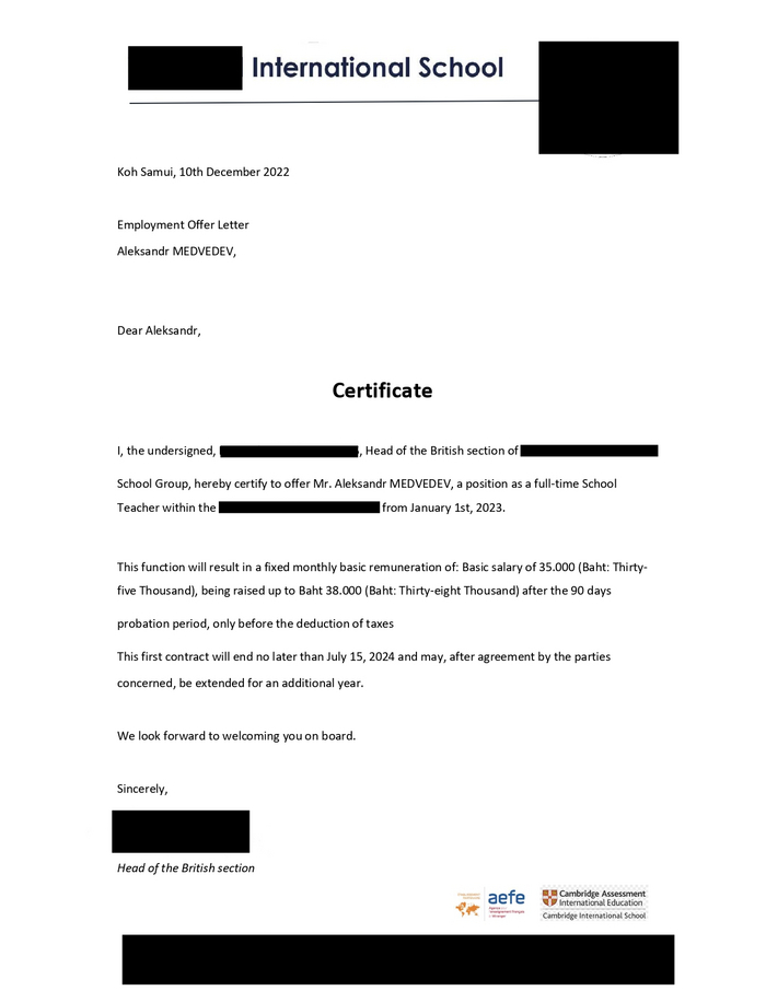 Через неделю я получил официальное приглашение на работу учителем. На испытательный срок мне предложили зарплату 35 000 THB (84 463 ₽), а после — 38 000 THB (91 702 ₽). Это минимальная зарплата учителя в международной школе в Таиланде. Перелет на остров и проживание мне не компенсировали. Я согласился и стал собирать документы, чтобы уже в начале января приступить к работе.