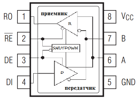 В стандартных трансиверах интерфейса RS-485 передатчик и приемник интегрированы в одном корпусе и подключены к общей двухпроводной линии, направление выбирается выводом микроконтроллера, уровень на которой определяет в каком режиме микросхема, в приеме или в передаче.