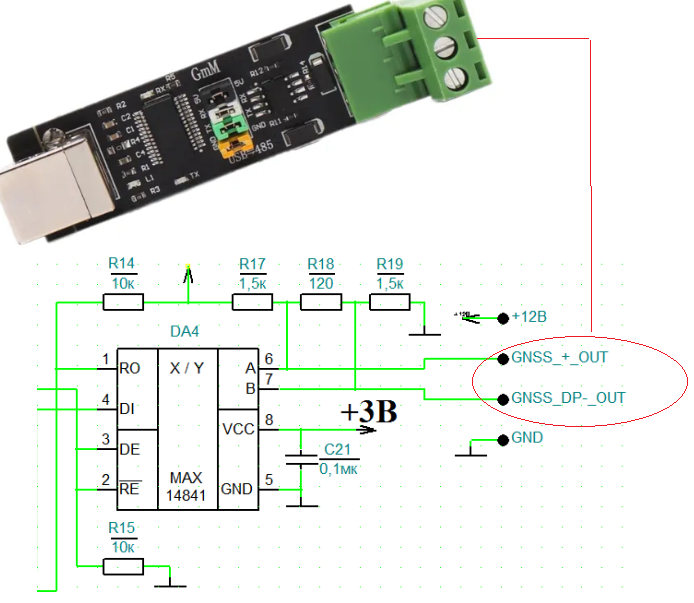 В данной схеме используется GNSS-приемник работающий по RS-232, о том как с ним работать я писал статью [Прием и парсинг NMEA-данных от GPS-приемника], в этой статье коммутатор будет принимать данные от GNSS приемника, собирать их в пакет и отправлять ведущему устройству по RS-485.