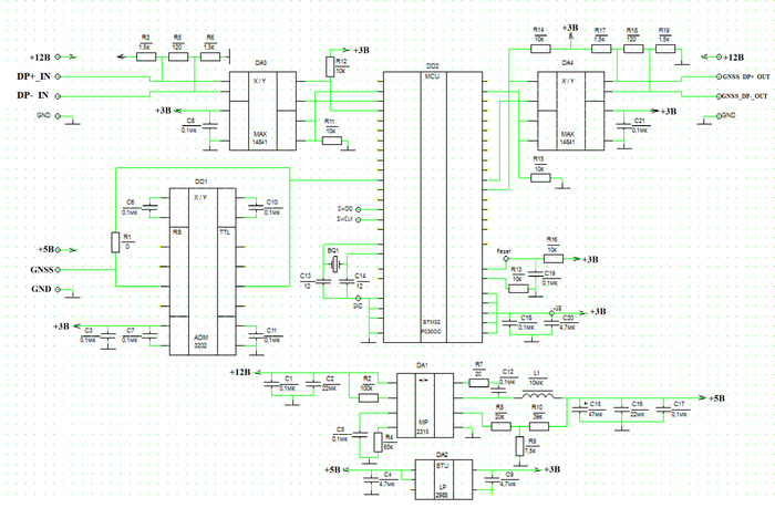 Вывод NRST(reset) используется для аппаратного сброса МК, подключается через резистор R16(10кОм) к питанию +3В — подтягивает NRST к логической «1», конденсатор С19(0,1мкФ), формирует RC-цепочку, используется для подавления помех и автосброса при включении питания, данный пример схемы гарантирует корректный старт МК после подачи питания, защищает от ложных срабатываний при скачках напряжения.