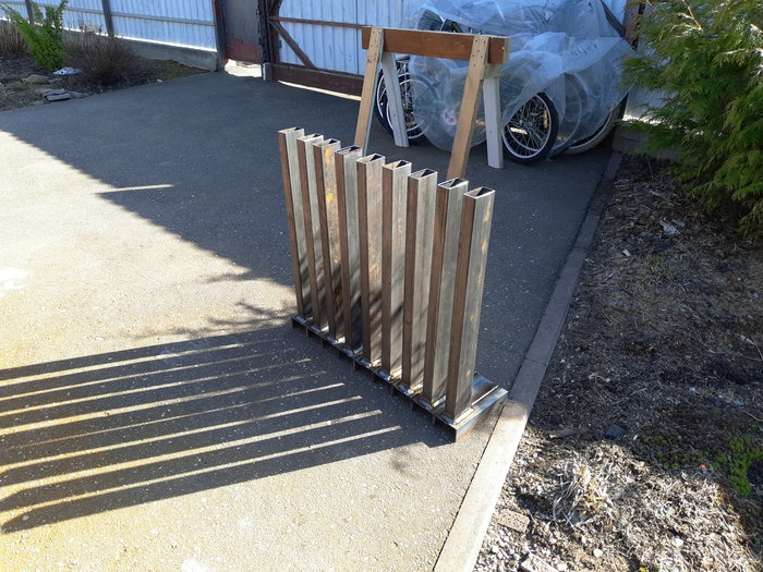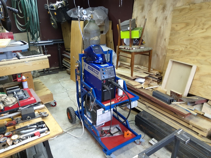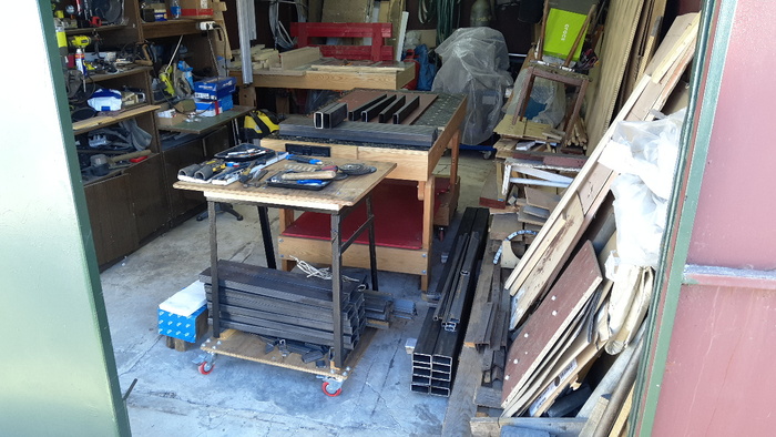 Это мой полуавтомат. Тележка распространенной диайвайной конструкции с просторов ютуба - первое самостоятельно сваренное изделие. На этой фотографии опять же видна свалка, для устранения которой нужен стеллаж.