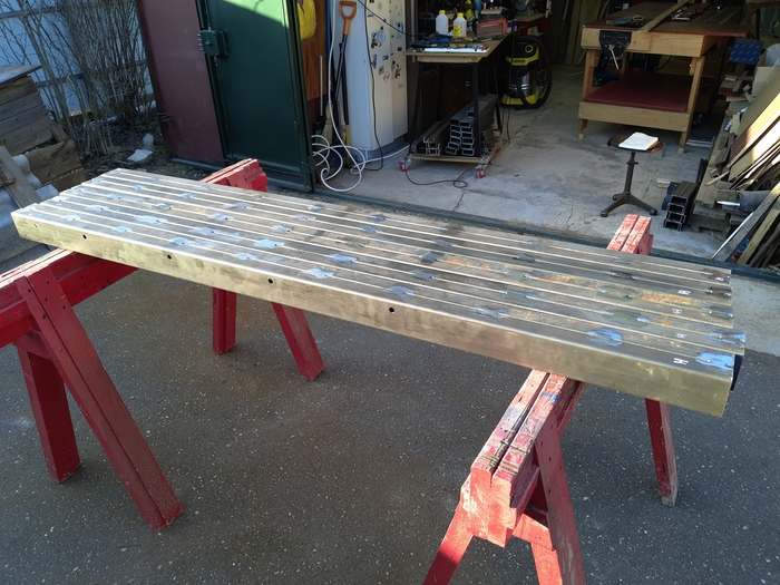 На нижнюю опору взял швеллер. В качестве гнёзд для регулируемых ножек приварил усиленные гайки. В качестве ножек будут мебельные болты с грибовидной головкой.