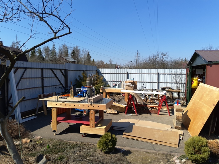Писал ранее, но повторюсь: имеется металлический гараж, который использую как дачную мастерскую. Спектр работ соответствующий: лайтовая столярка, плотницкие заготовки, сварка металлических конструкций и т.д. и т.п.