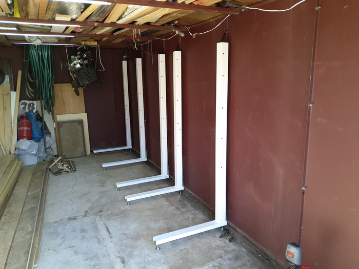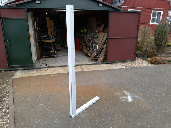 Всё это дело выставил по лазеру, сверху можно заметить крепления к стене. Они тоже самодельные, позволяют варьировать расстояние до стены, отдельно их к сожалению не отфотографировал. Стойки сделаны по числу сочленений стеновых панелей гаража - чтобы можно было прикрутить их к штатным местам крепления стеновых панелей. Расстояния между стойками - метр и пол метра. Под ножки подложил усиленные шайбы для увеличения площади опоры. Просто подложил, не приваривал.