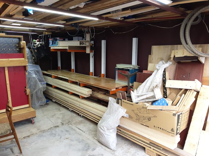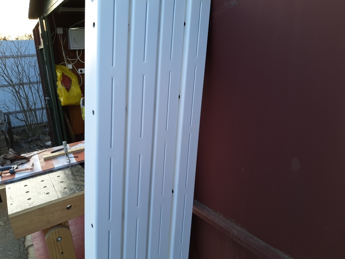 Не стал делать стеллаж на всю стену, справа оставил место для хранения обрезков и листового материала. По задумке когда-нибудь под это дело появится стеллаж на колесах.