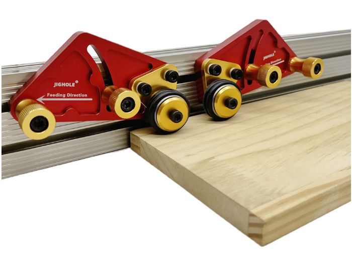 Они состоят из направляющих т-треков, устанавливаемых на столе станка, и роликовых направляющих, которые крепятся к основанию кондуктора. Ролики позволяют легко перемещать заготовку вдоль станка, обеспечивая плавную подачу и одновременно удержание ее в нужном положении.