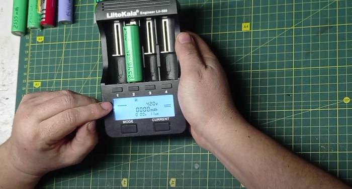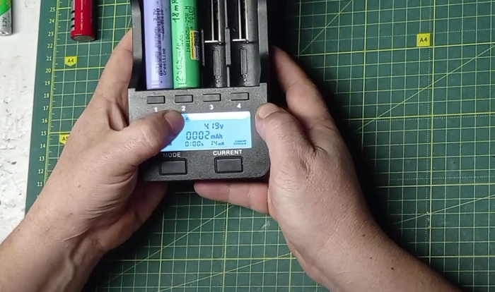 Допустим возьмем литиевый аккумулятор вставляем его в любой слот и прибор включает режим зарядки "Charge".