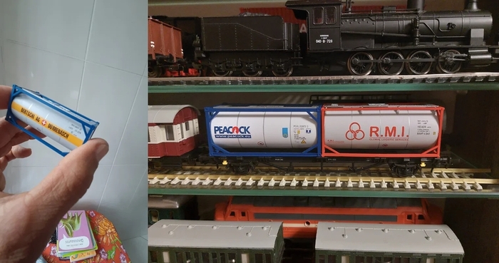 Миниатюрная модель грузового контейнера с цистерной в масштабе 1:87. Стоит штука 980 руб. Ссылка на них. 20 видов на выбор.