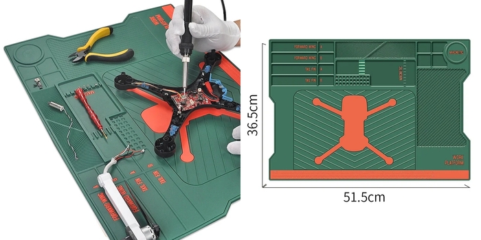 Силиконовый зелёно-оранжевый коврик для разборки и ремонта квадрокоптеров. Размеры 51х36 см. Ссылка на него
