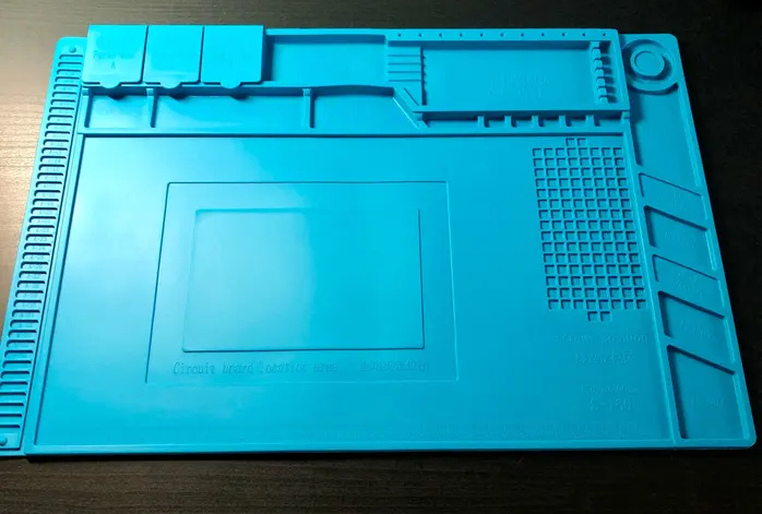 Термостойкий непрогораемый голубой коврик для пайки с несколькими магнитными отделениями, а также множеством других для хранения мелких шурупов и инструментов. Размеры 45X30см. Стоит такой 740 руб. Ссылка на него
