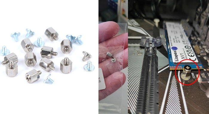 Простые и очень нужные винты с шестигранной гайкой для крепления накопителя M.2 SSD в компьютер. Стоит комплект из 10 штук 120 руб. Ссылка на набор. Также есть чёрного цвета.