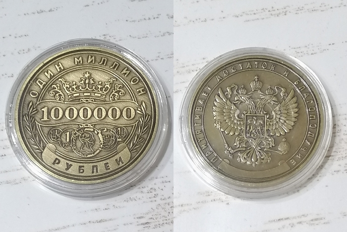 Сувенирная монета 1 миллион рублей, сталь, позолота. Стоит такая 118 руб. Ссылка на неё
