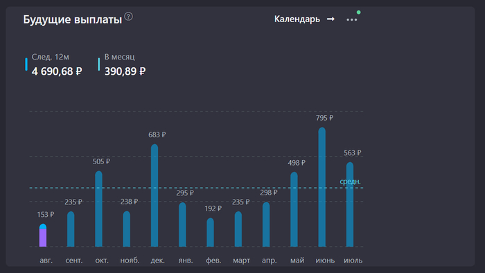 Но только по этим акциям. Напомню, что в августе я покупал их именно под осенние дивиденды, поскольку ожидал их. Да, ожидал больше, но сложилось как сложилось. В итоге, прогноз дивидендов на ближайшие 12 месяцев снизился с 5 089 до 4 690 рублей после налогов.