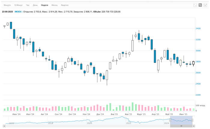 Индекс немного подрос за неделю, но мы в боковике 2700-2800 находимся уже довольно долго. Рынок продолжает ждать главную новость и снижение ключевой ставки, чтобы появились хоть какие-то предпосылки для роста.