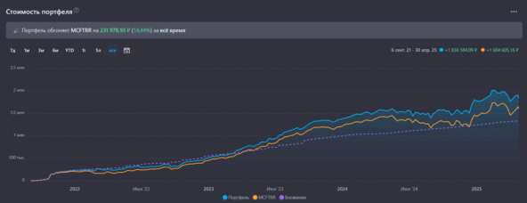 Веду невидимый бой с тенью под названием «Индекс Московской биржи полной доходности». За все время моего инвестирования, мой портфель обгоняет индекс на 231 978 ₽ или +14,4%.