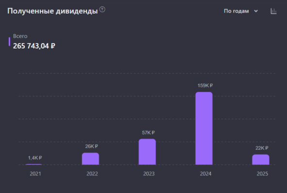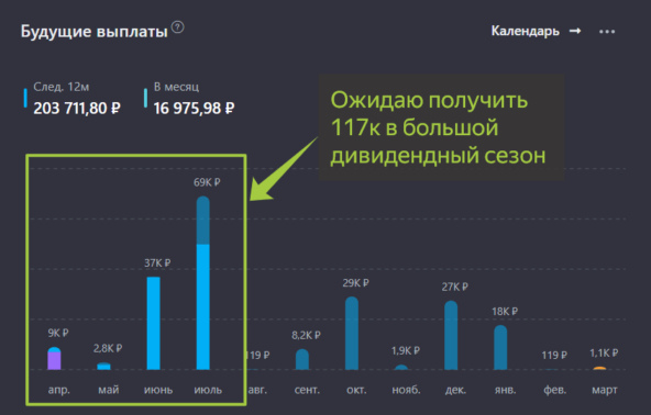 Мой пассивный доход постепенно растет от регулярных пополнений и реинвестирования получаемых дивидендов и купонов. По прогнозам на следующие 12 месяцев мой портфель наполнится на общую сумму 203 000 ₽.