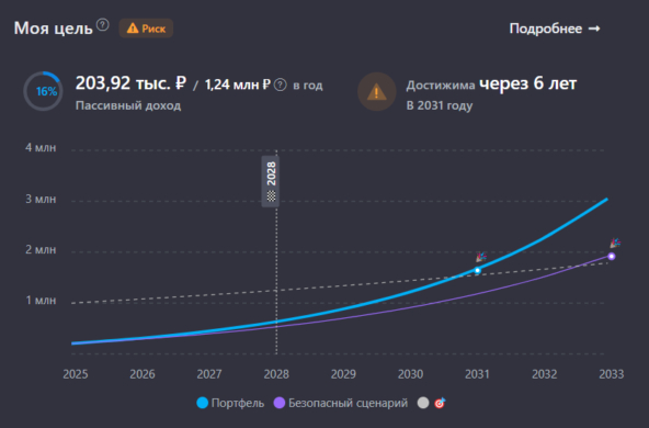 Промежуточная цель, к которой я стремлюсь – это 1 000 000 рублей дивидендами в год с учетом инфляции. По данным сервиса учета инвестиций, цель будет достигнута в 2031 году. На данный момент цель выполнена на 17% из 100%, а 1 миллион сегодняшних денег, в 2028 году превратится в 1,24 млн рублей из-за инфляции.