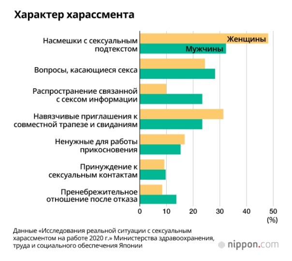 Опрос, проведенный Министерством здравоохранения, труда и социального обеспечения, показал, что каждый четвертый студент, участвовавший в поиске работы и стажировке для получения рабочего опыта, подвергался сексуальным домогательствам со стороны сотрудников компании-нанимателя, при этом почти одинаково страдали и юноши, и девушки – 26% и 25,1% соответственно, при этом чаще подвергаются домогательствам аспиранты.