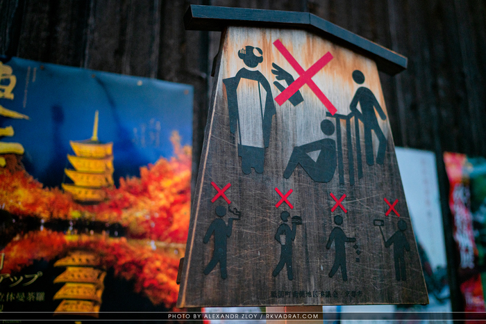 Табличка, указывающая на то, что трогать гейш запрещено. Но она необязательна... В Гионе увидеть хоть одну гейшу надо постараться. Все они прячутся по местным заведениям, зная нас, пронырливых иностранцев)))