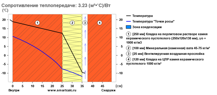 Теперь то же самое для каркасного дома сравнимой теплопроводности. Ну, чуть больше, но это совсем стоковый вариант - каркас в плёнках и 150 мм утеплителя между стоек. В том смысле, что подогнать теплопроводность под стену автора я не могу технически, из-за толщины утеплителя: