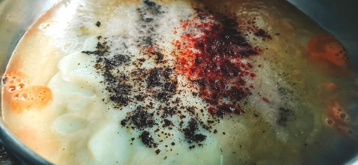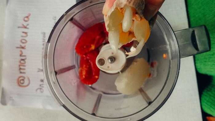 Теперь последний зубчик чеснока через давилку туда - фигак! И выключаем нагрев. Кто не любит чеснок - никаких фигак, упаси боже. Кто любит - при таком подходе он проявит себя в лучшем виде.