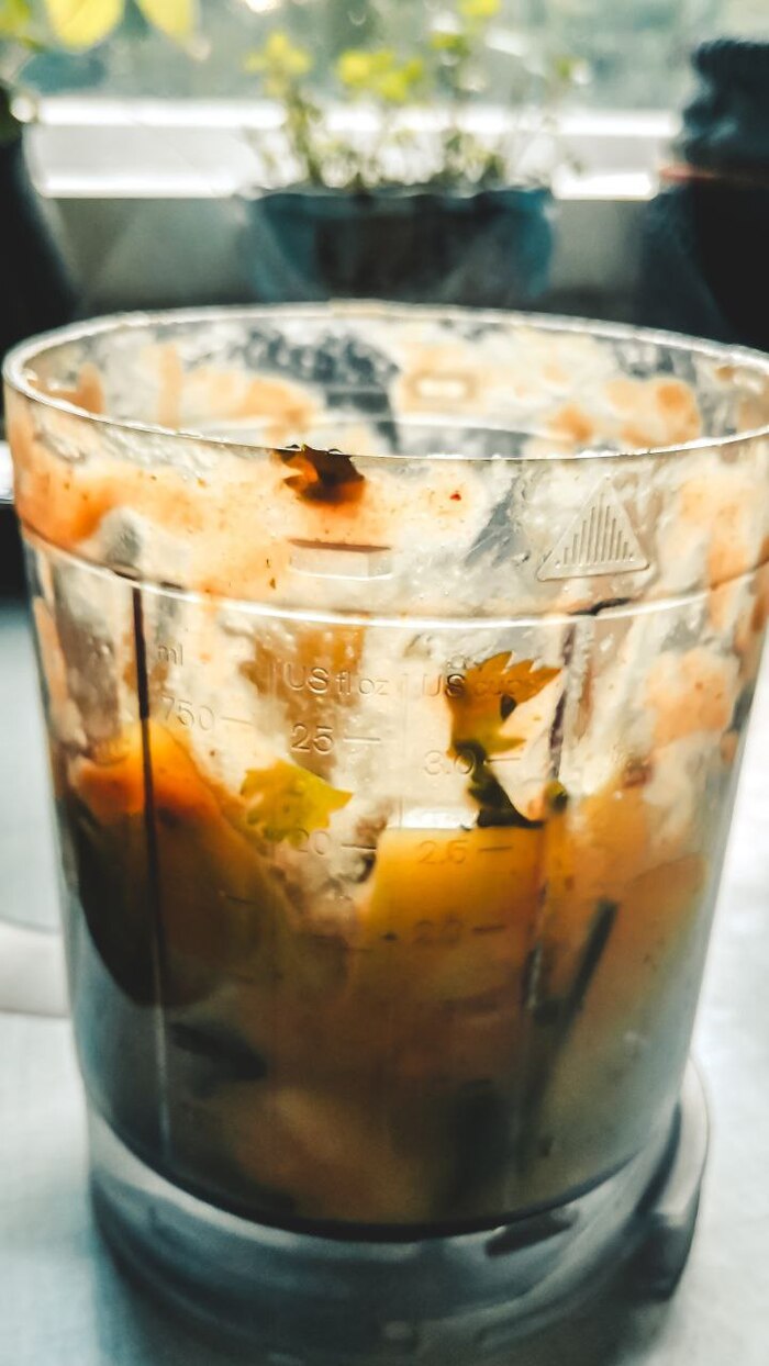Лук надо резать кубиками без фанатизма. В смысле красотой можно не заморачиваться, всё равно всё распустится в гомогенный соус. Однако сам факт нарезки важен - я как-то поленилась и перебила лук в чаше блендера с ножами. Так вот текстура соуса получилась какая-то крупитчатая, режьте, серьёзно.
