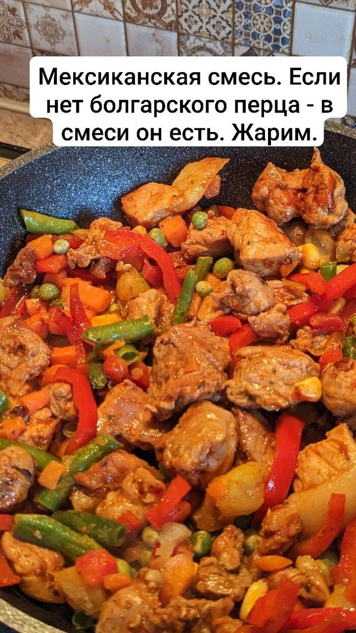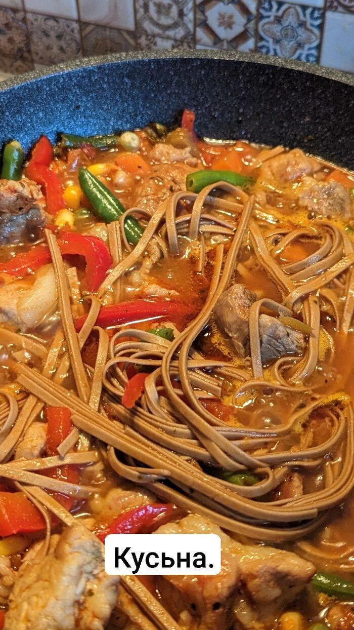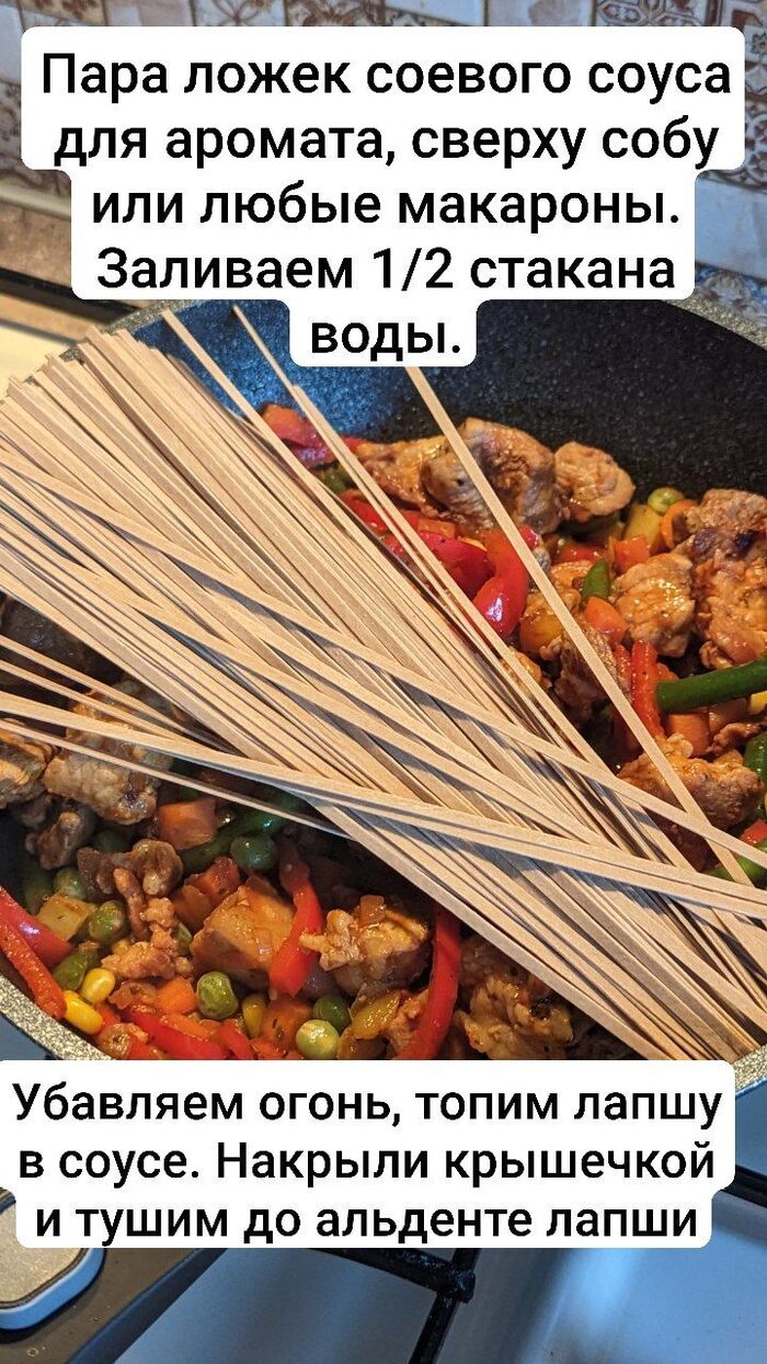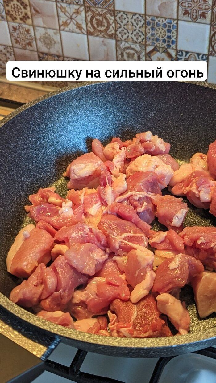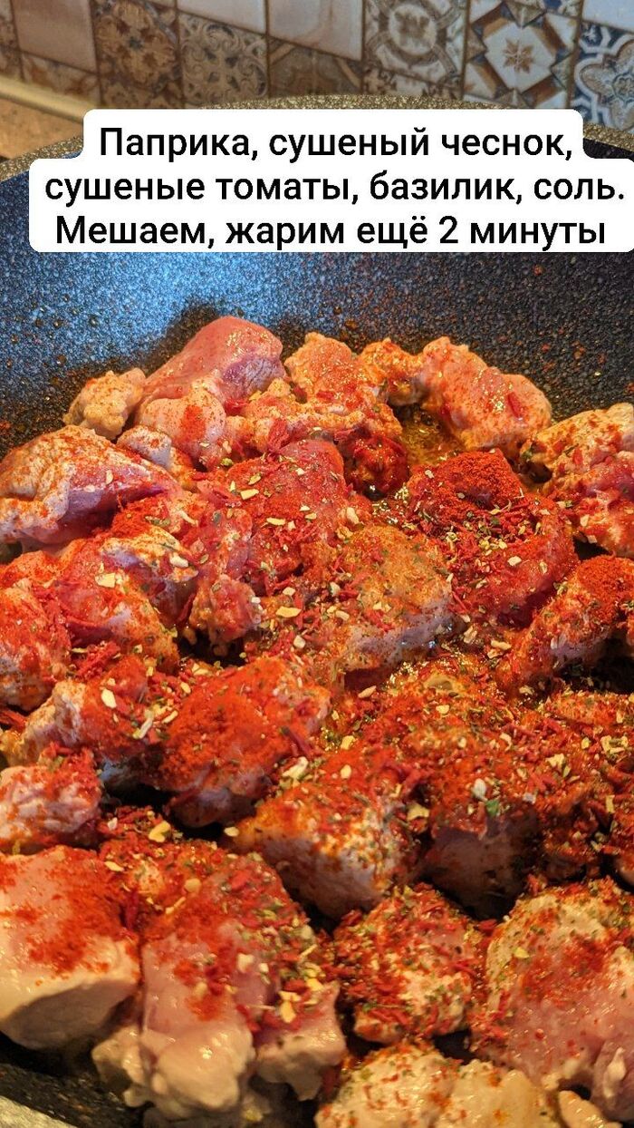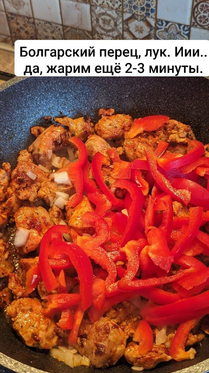 Солим, добавляем черный перец буквально за 3 минуты до выключения газа, засыпаем мясо. Выключаем газ.