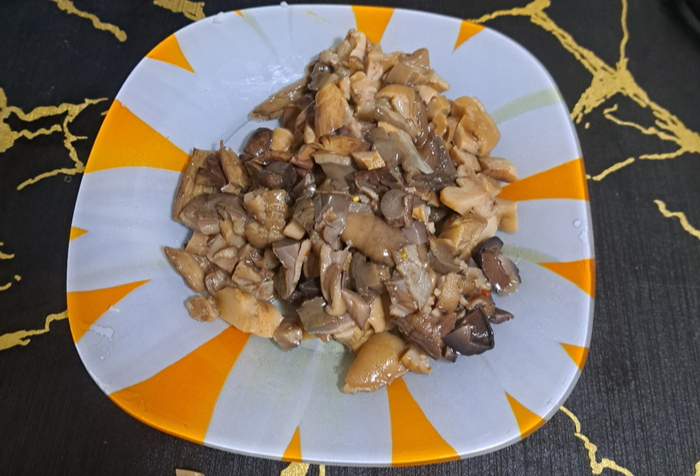 Время у нас еще есть. Режем маринованные грибы, предварительно слив жижу.