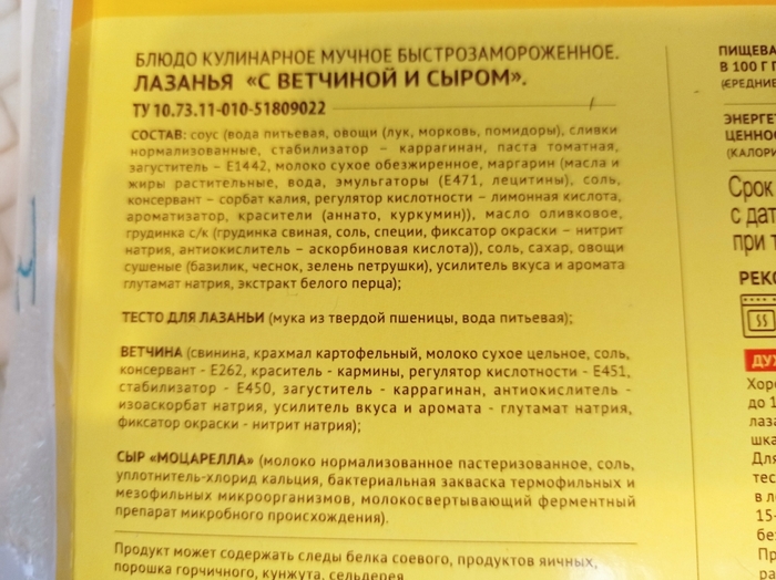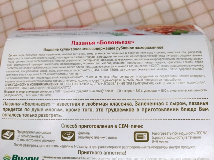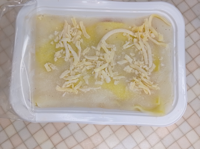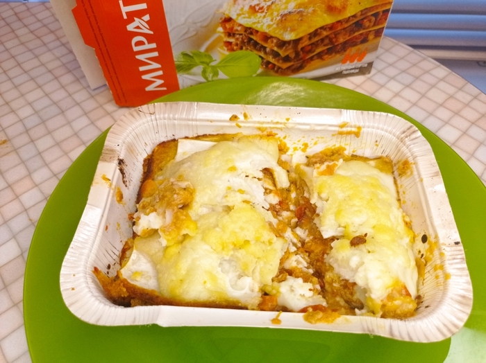 В ленте я купила 4 лазаньи от разных производителей. Интересно, что на двух из них были указаны два способа приготовления: микроволновая печь и духовой шкаф. А на двух других только микроволновая печь. Я решила не отходить от инструкций и две лазаньи разогревала в духовке, а две в микроволновке, предварительно все лазаньи побыли при комнатной температуре, чтобы они немного оттаяли.