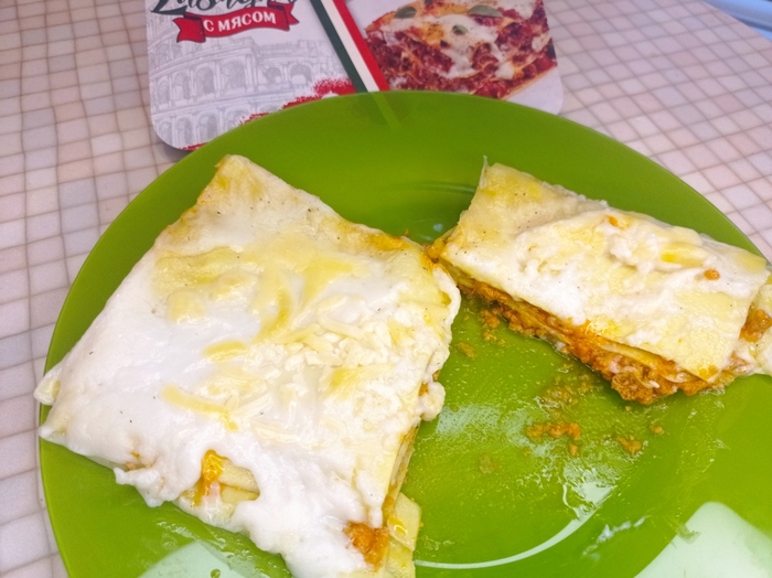 С выбором я не ошиблась, это было вкусно. Тесто нежное, не плотное, слои легко отделяются, всего пять слоев, вкус гармоничный, ингредиенты хорошо сочетаются между собой, нет выделяющихся приправ, просто и питательно, как и должно быть. Сырная корочка сверху даёт небольшую кислинку, вкусом ты реально наслаждаешься, поэтому будем отталкиваться от этого.
