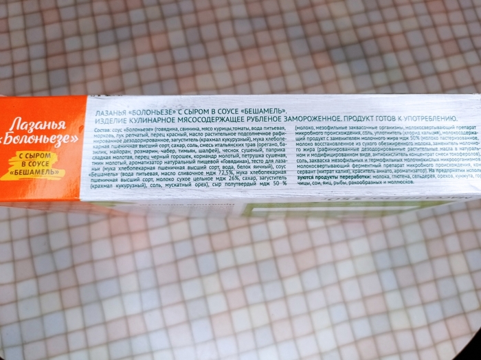 Эта лазанья имела самый непрезентабельный вид в замороженном состоянии, скорее всего ее не раз размораживали и замораживали. У лазаньи три слоя, сверху вкусный соус типа бешамель, выделяется базилик среди приправ, в принципе хорошо, но немного уступает первой лазанье. Кстати два первых образца я грела в микроволновке и за 10 минут они полностью не разогрелись.