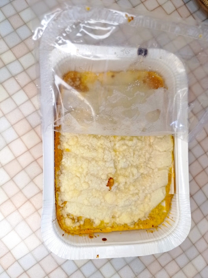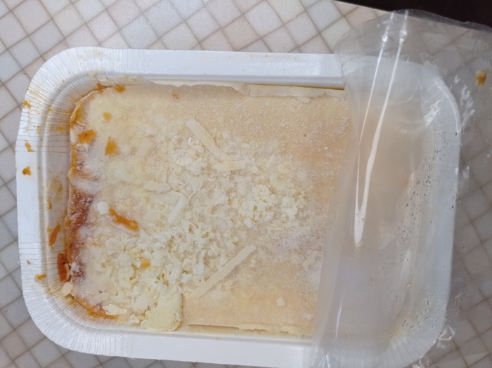 Я не смогла выложить лазанью на тарелку, она вся разваливалась и напоминала кашу или мягкий кошачий корм. На фото видно в левой части сырой слой теста. Количество слоев определить не удалось, на вкус так же как и на вид - очень плохо. Является ли нормой такое состояние самой дорогой (из купленных) лазаньи, я не знаю, но больше одного кусочка я не смогла съесть.