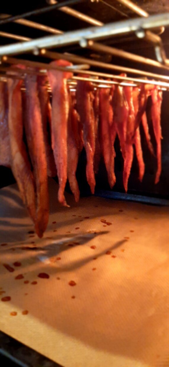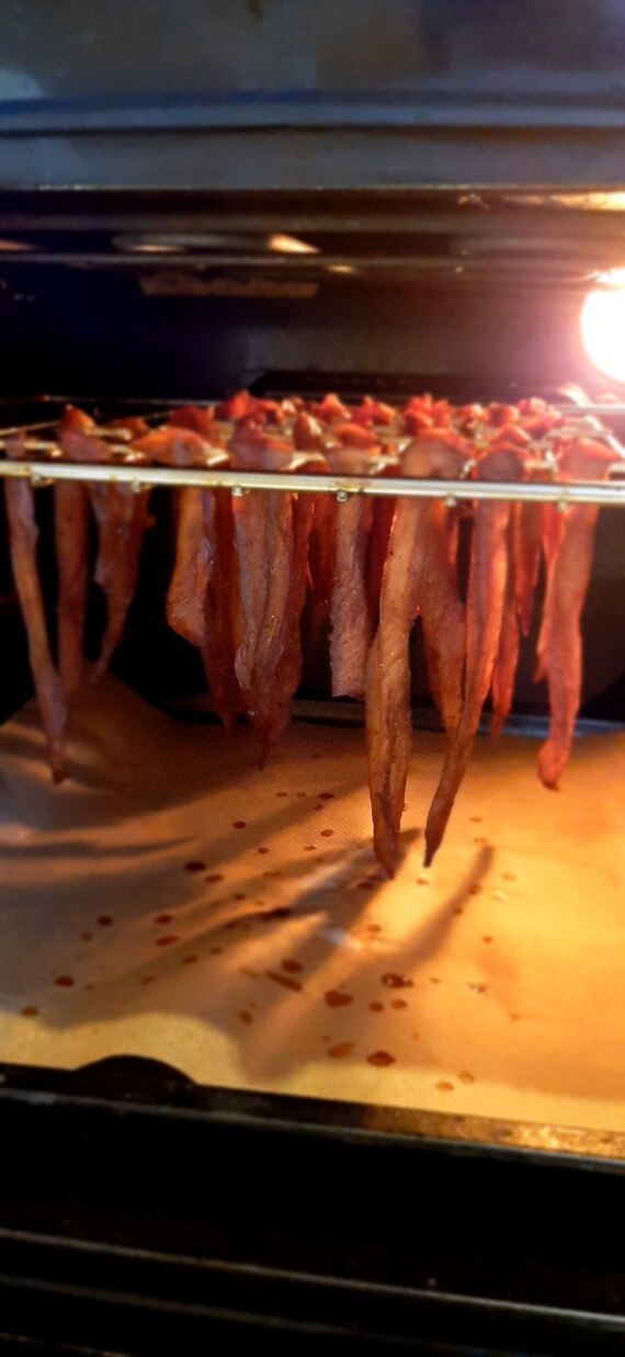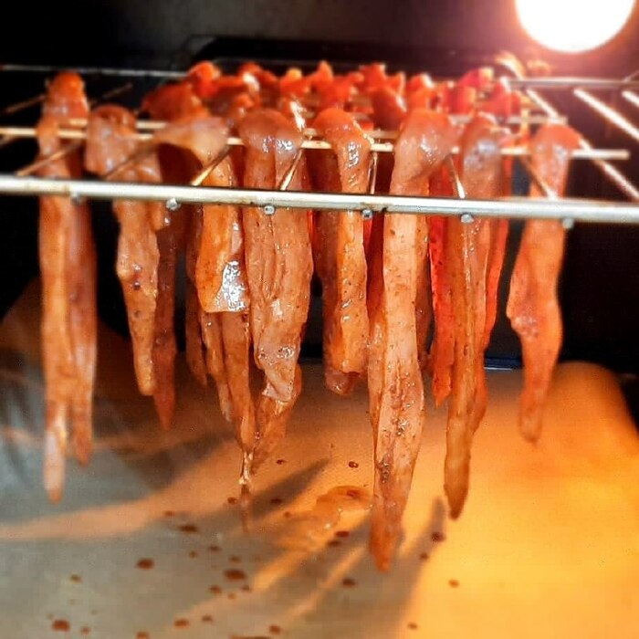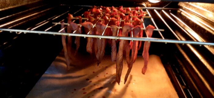 Нарежьте грудку на полоски, примерно по толщине 1х0,5 см. Замаринуйте ее минимум на полчаса. Чем дольше маринуете, тем интенсивней вкус специй получите. Я продел полоски шпажками и повесил на решетку в духовку (на фото). Сушить часов 5-6 при температуре 50-60 приоткрыв дверцу (если есть конвекция как у меня, то его обязательно включите). По истечении времени, дайте курице немного остыть (это быстро, она сильно не нагрелась) и закуска к напиткам готова!