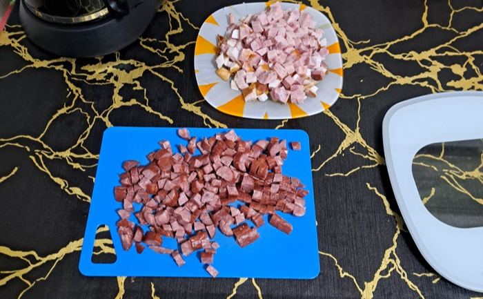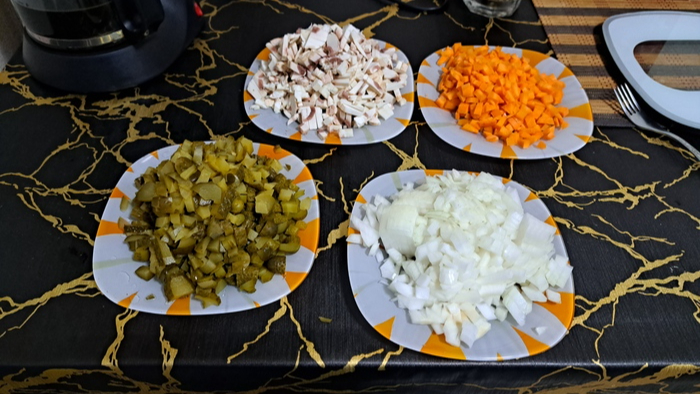 Пока оно там происходит превращаем хорошие продукты в крошево (для начала овощи и грибы). По размеру кусочков - кому как нравится. Мне нравится меленько и я задолбался резать, особенно огурцы и оливки.