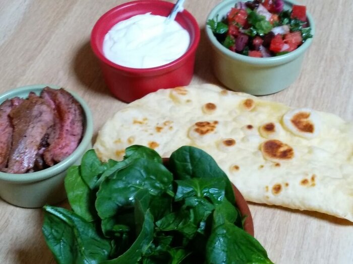 На наан выложите шпинат, затем греческий йогурт, нарезанные ломтики стейка и томатную сальсу.