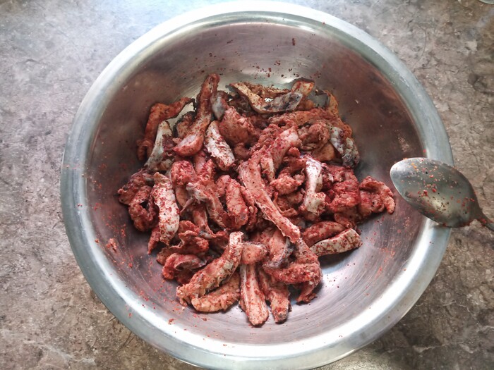 1) Куриное филе режем средними ломтиками. Чеснок также мелко рубим.