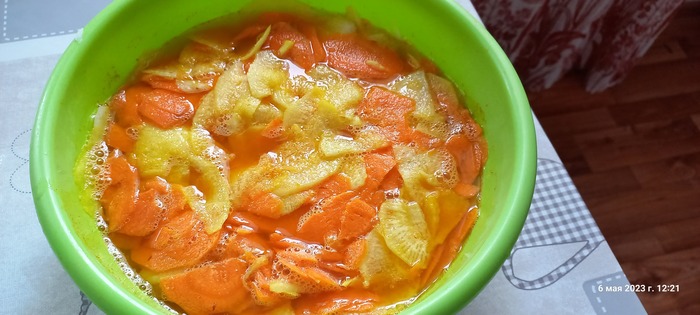 2. Через два часа сливаем образовавшийся рассол , немного промываем нарезку холодной водой. ( Налили в эту ёмкость воды , перемешали - слили . 2 раза.) Далее отжать рыбу руками и переложить. Добавляем черный молотый перец , кориандр , паприку и хорошо перемешиваем.