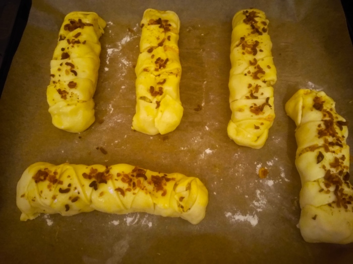 4.Сворачиваем лаваш в плотный рулет, перекладываем на противень и смазываем сверху лаваш желтком, по желанию можно посыпать маком или кунжутом для украшения.