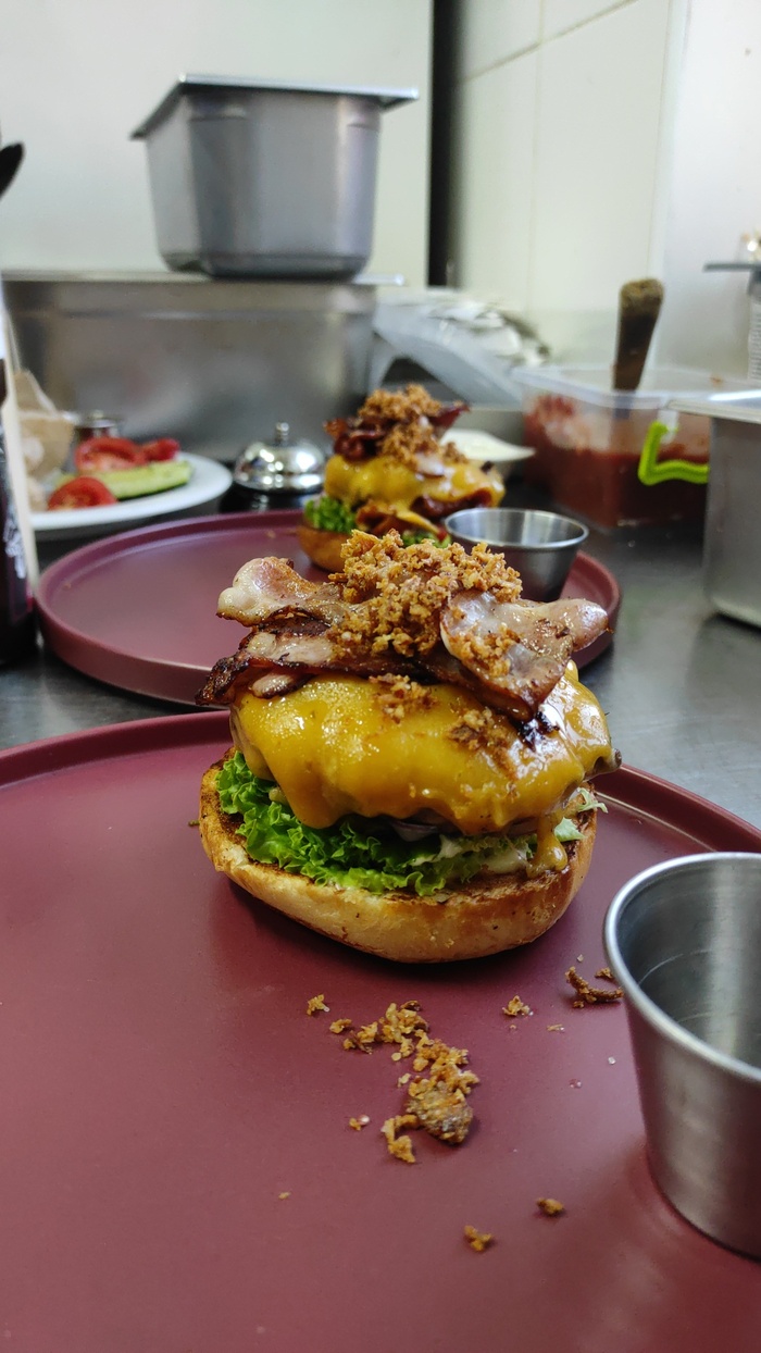 Булочки разрежьте поджарьте. Чеддер нарежьте. На нижнюю булочку выложите 2 куска чеддера, сверху рваную свинину, соус барбекю, бекон и луковые кольца. Накройте верхней булочкой.