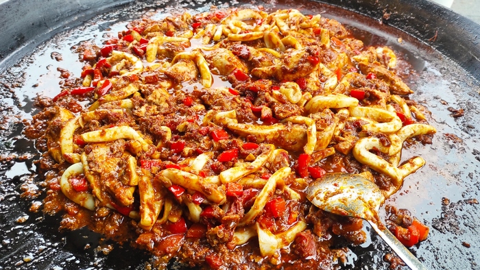 Выньте мясо. Жидкость процедите. Мясо разберите на волокна и переложите в процеженный бульон.