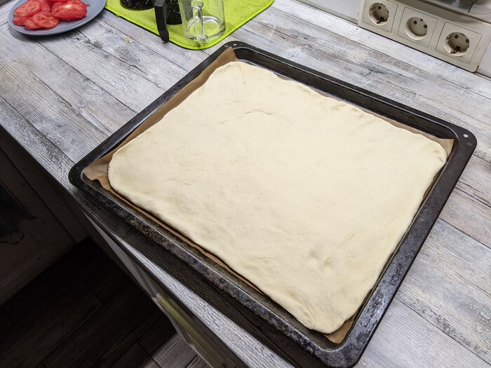 2. Берем форму и перекладываем туда полученное песочное тесто. Распределяем тесто по форме, формируя плотный слой коржа с высокими бортами.