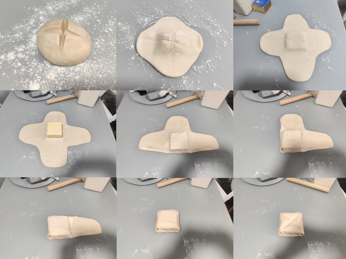 Достал тесто из холодильника и начал раскатывать будущий конверт для теста и формировать конверт с маргарином внутри. В конце сделал крест, прижал маргарин к тесту, чтобы не поехал.
