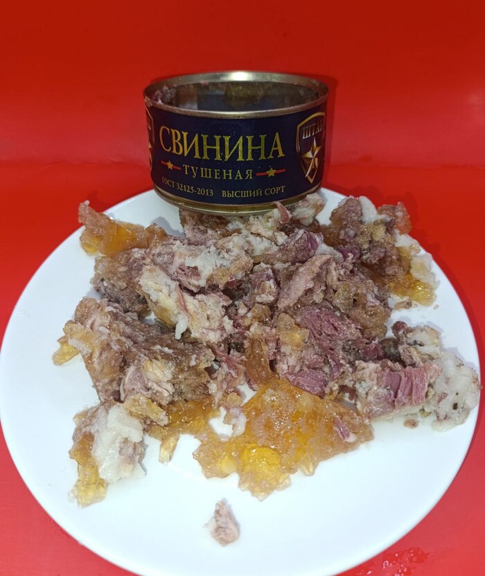 В этой тушёнке волокна были, а что ещё нужно? Мясо сладкое, как будто пожалели соли и перца, но в принципе не ужасно (особенно после сои), я даже хотела оставить эту тушёнку, но когда начала расковыривать содержимое, то поняла что я всё мясо съела во время дегустации, остался только жир, желе и другие несъедобные части свинки. То есть за 200 рублей вы получите 25-30 процентов мяса и кучу несъедобного наполнения.